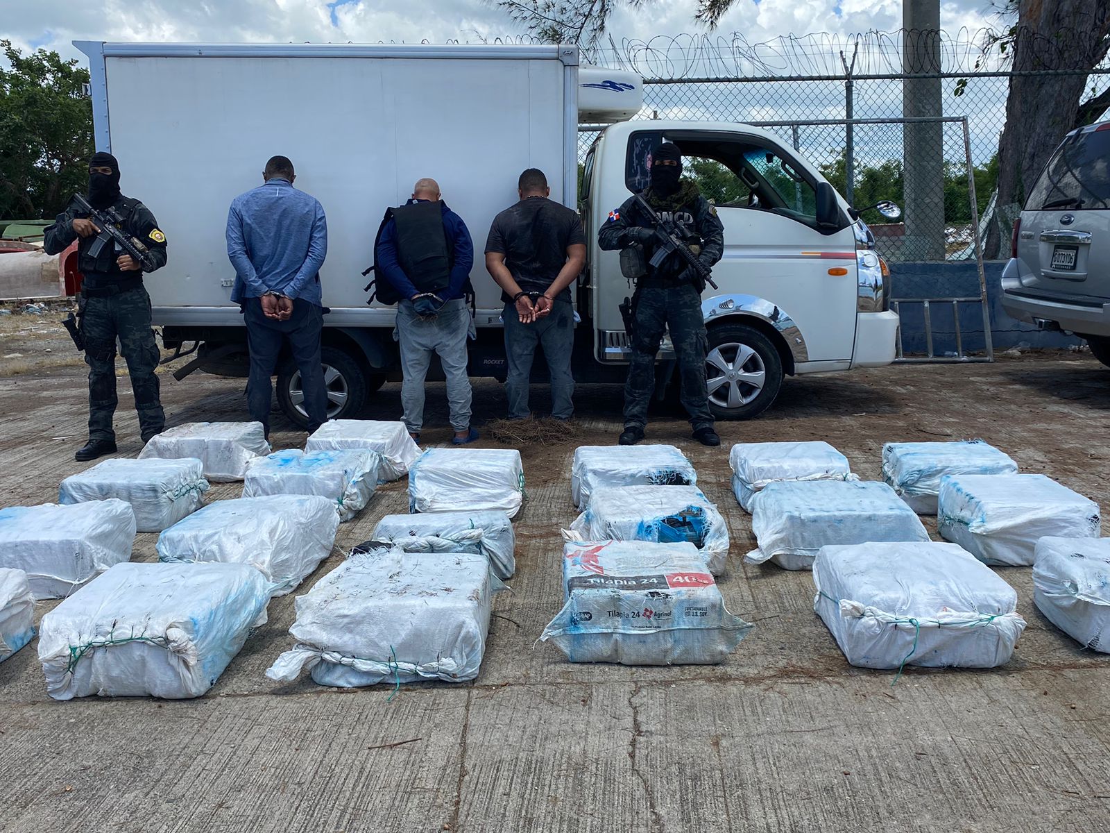 Al abordar la lancha se arrestaron a tres hombres (dos colombianos y un dominicano) y se incautaron 20 pacas conteniendo los 590 paquetes de una sustancia que presumimos es cocaína.