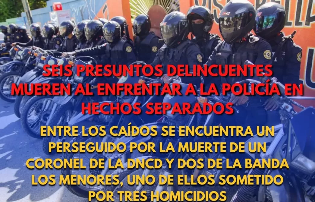 El Horizonte, Santo Domingo RD.- La Policía Nacional reportó este jueves la muerte ayer en acciones policiales de seis presuntos delincuentes, en hechos separados, quienes eran perseguidos mediante ordenes de arresto en su contra acusados de múltiples hechos delictivos y criminales.